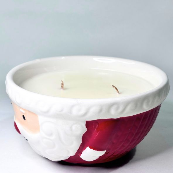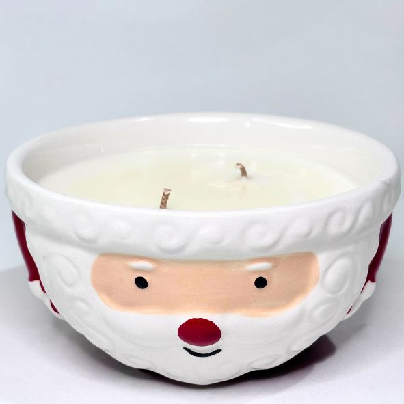 Lumânare premium, turnată manual, în recipient festiv de ceramică reutilizabilă Moș Crăciun. Amestec de ceară naturală Soia-Cocos, 2 fitiluri din bumbac și 368g de ceară. Parfum irezistibil (certificat IFRA) de Vanilie de Madagascar, Nucșoară și Note Lemnoase Calde. Timp de ardere: 70 ore. Cadoul perfect de Crăciun!